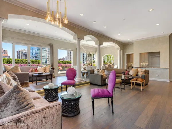 Stunning rarely available custom duplex penthouse with over 6000 sq ft of immaculate living space. One of Chicago's most unique homes with multiple outdoor spaces including a 3500 sq ft wraparound remodeled outdoor oasis with city and park views. Fall in love with the elegance and charm of this wonderful open concept home with beautiful finishes and details throughout. Sophisticated features from a spacious living room with dramatic high ceilings, formal dining room, expansive chefs kitchen that boast custom cabinetry, granite counters, large island, dumbwaiter to top level entertaining area, stainless steel appliances and a walk-in pantry. Three large bedrooms including a spacious primary suite with a walk-in closet and spa-like bathroom. Two additional large office spaces or Den for all your work and home needs. The second level family room and wet bar offers plenty of possibilities in the large open space; perfect for entertaining, lounging or working out. This home is perfectly situated in the Gold Coast. The Gold Coast is the best neighborhood for walking to everything Chicago has to offer. Two heated parking spaces with large storage rooms included in price. Additional heated parking available . See floor plan under Additional Information.